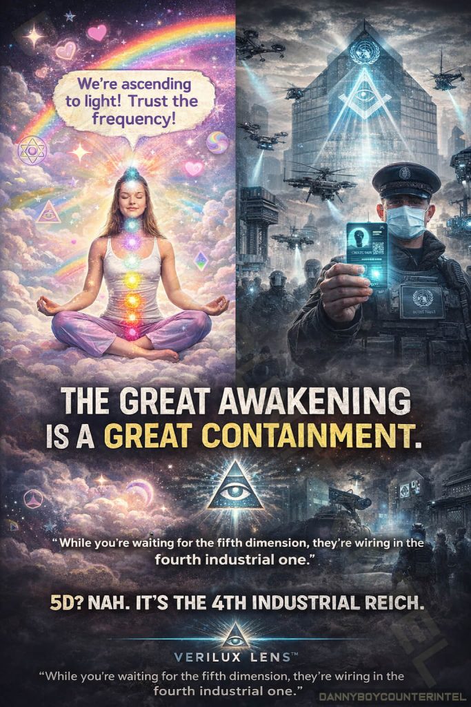 While millions meditate into the clouds waiting for light ships and soul activations, the infrastructure for a global digital dictatorship — the Fourth Industrial Reich is being rolled out beneath their levitating feet.